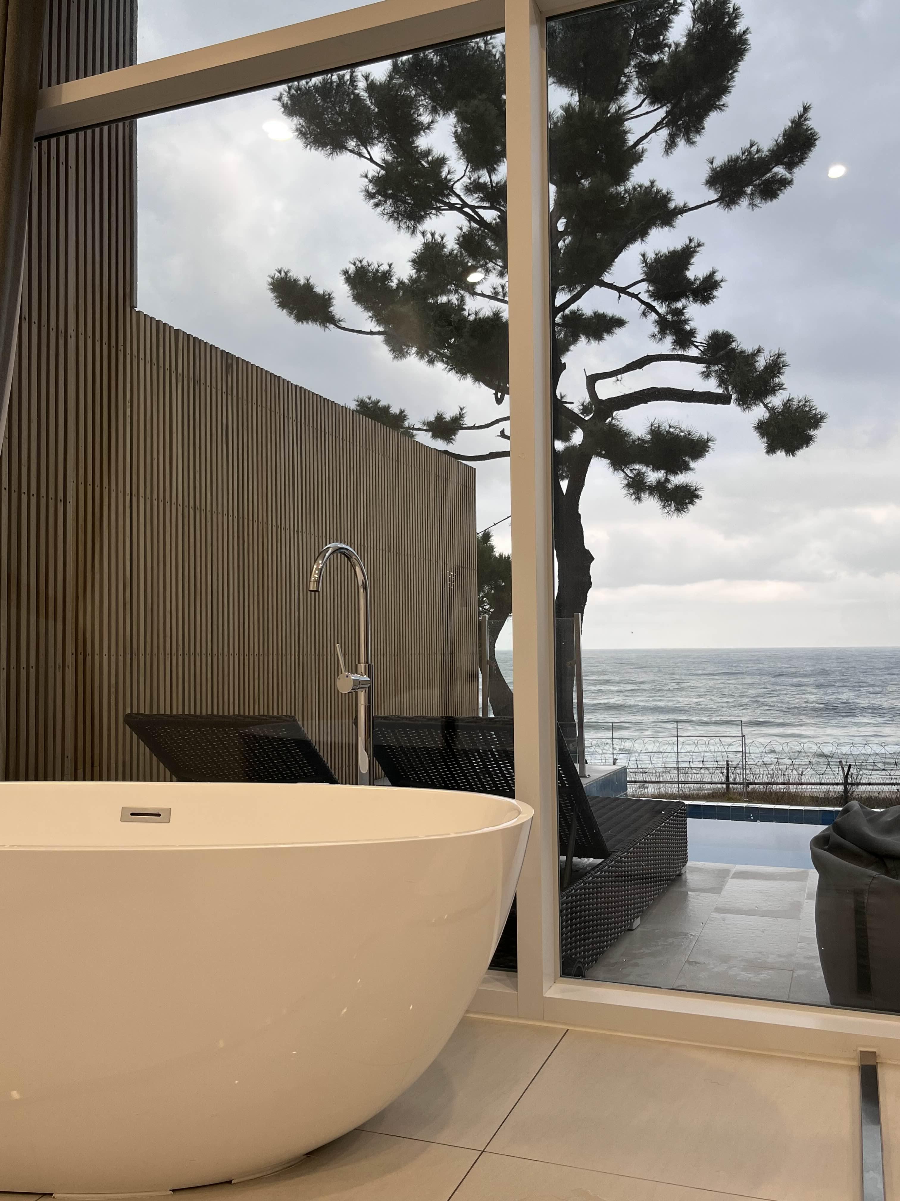 거실에 욕조가 있어서 반신욕하면서 일출과 바다를