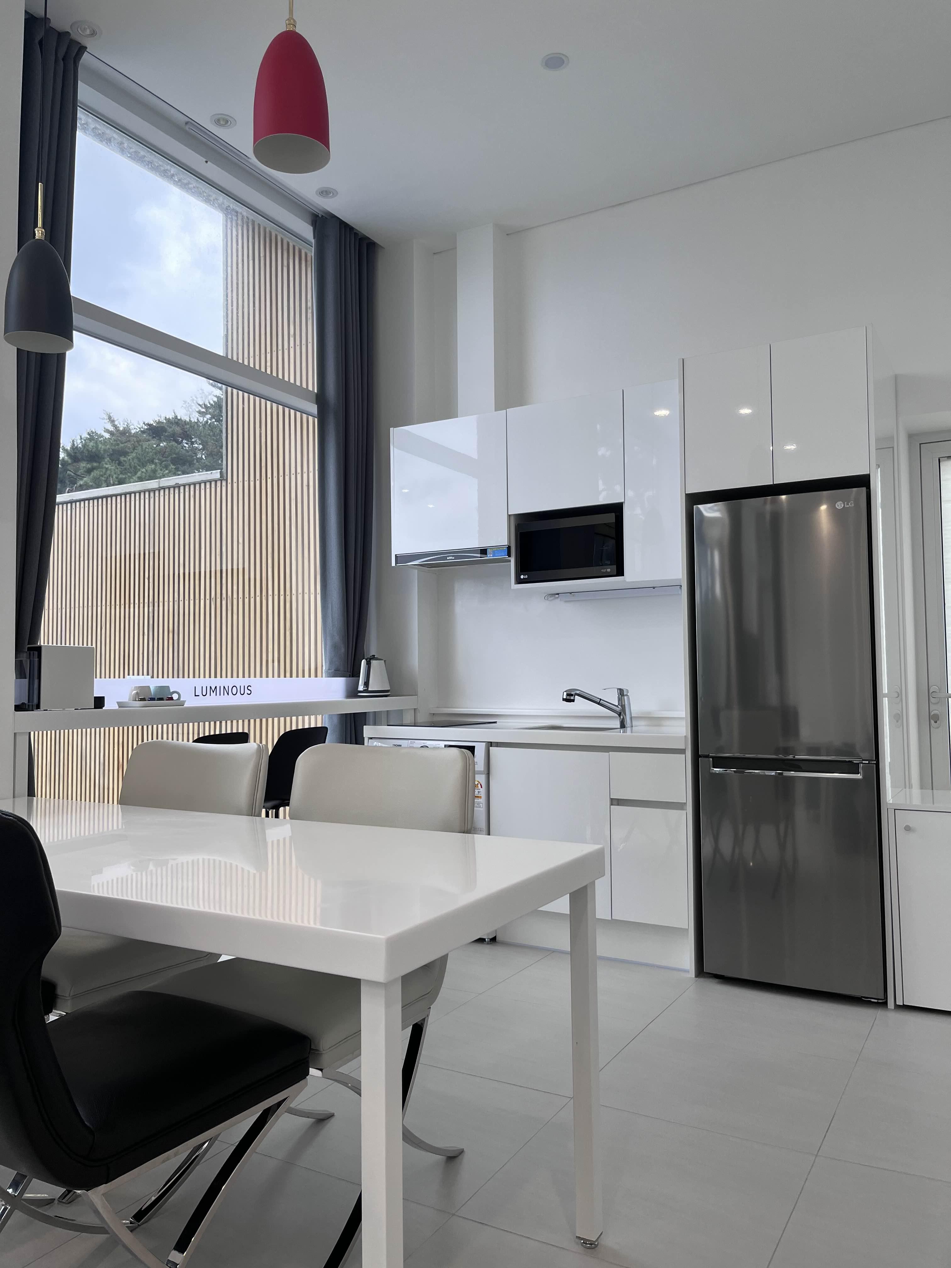 주방엔 식탁, 냉장고, 건조가능세탁기, 인덕션 등 가정집에 있는 주방기기들이 다 구비되어있어요.