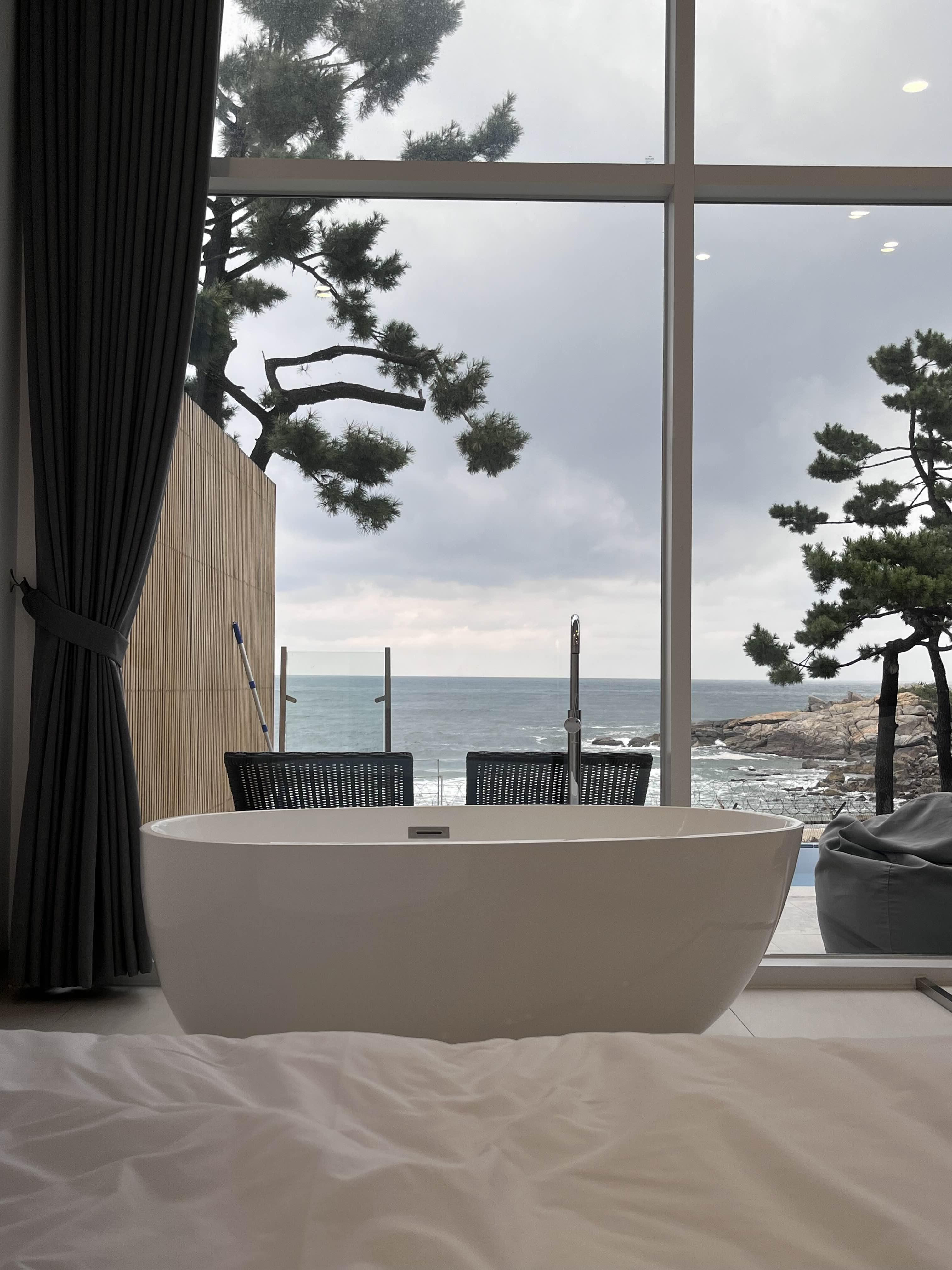 거실 침대에서 본 욕조와 바다뷰 오션뷰 풀빌라 인정!