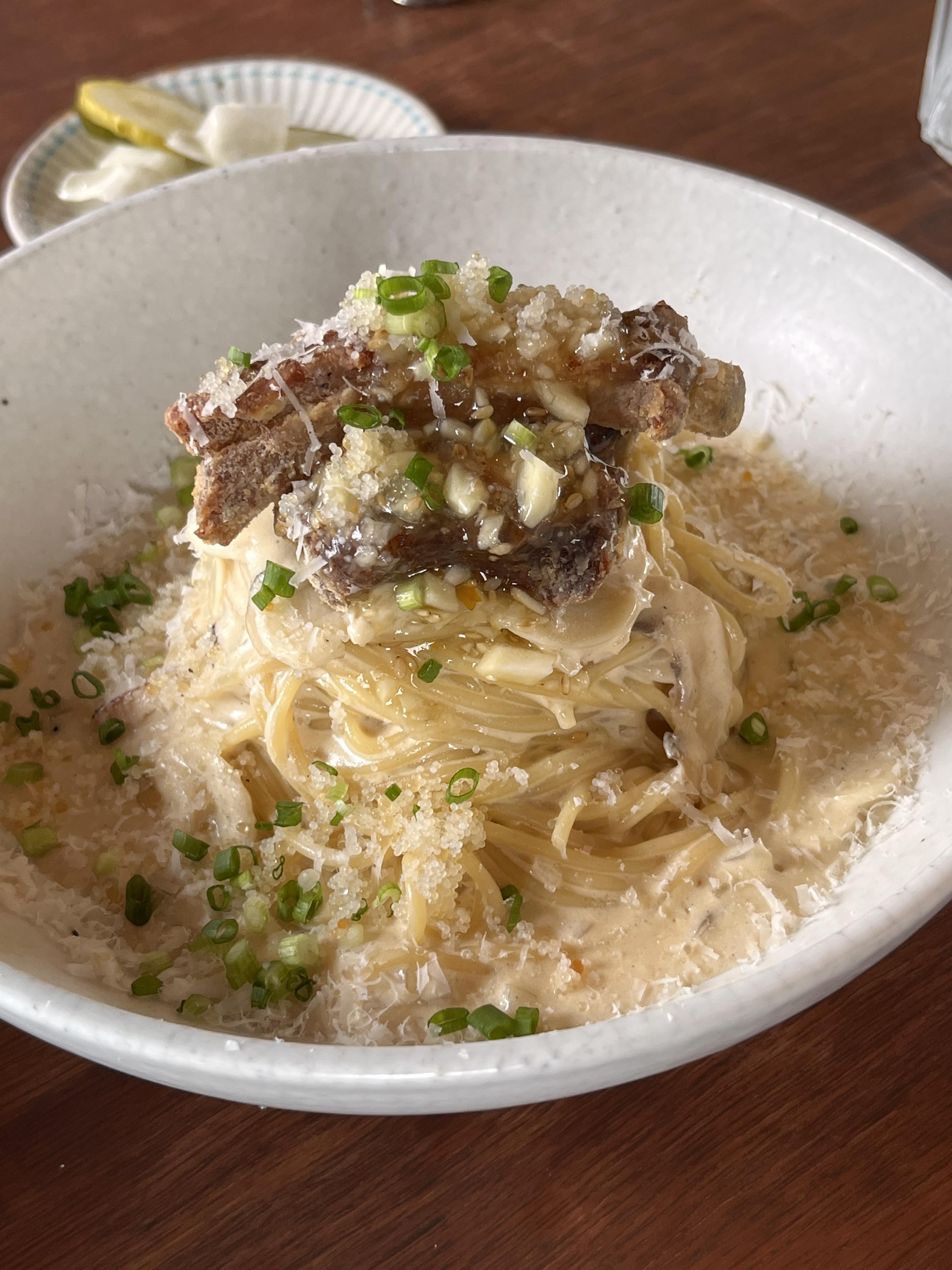 세 번째 요리는 등갈비까르보나라예요.