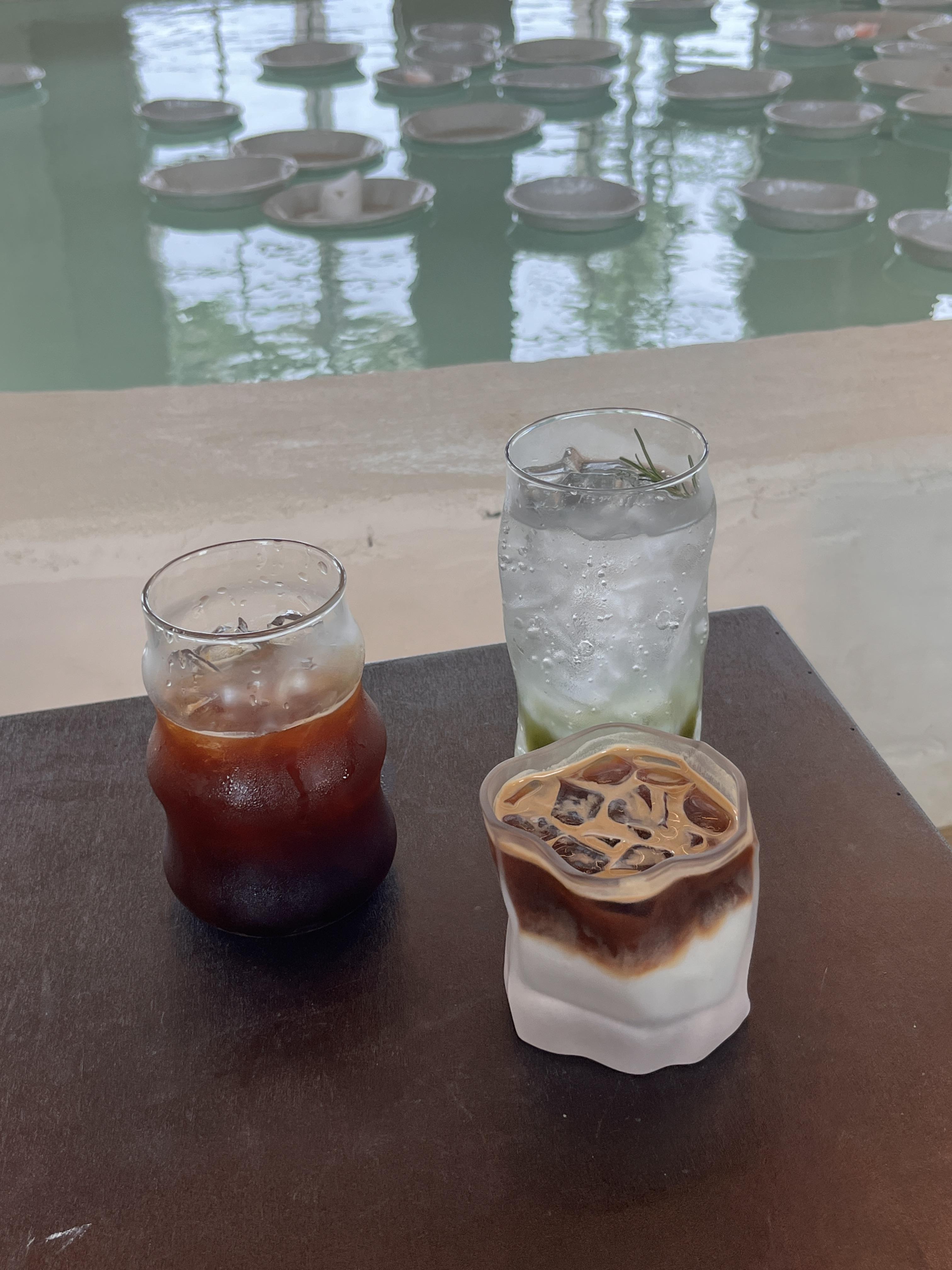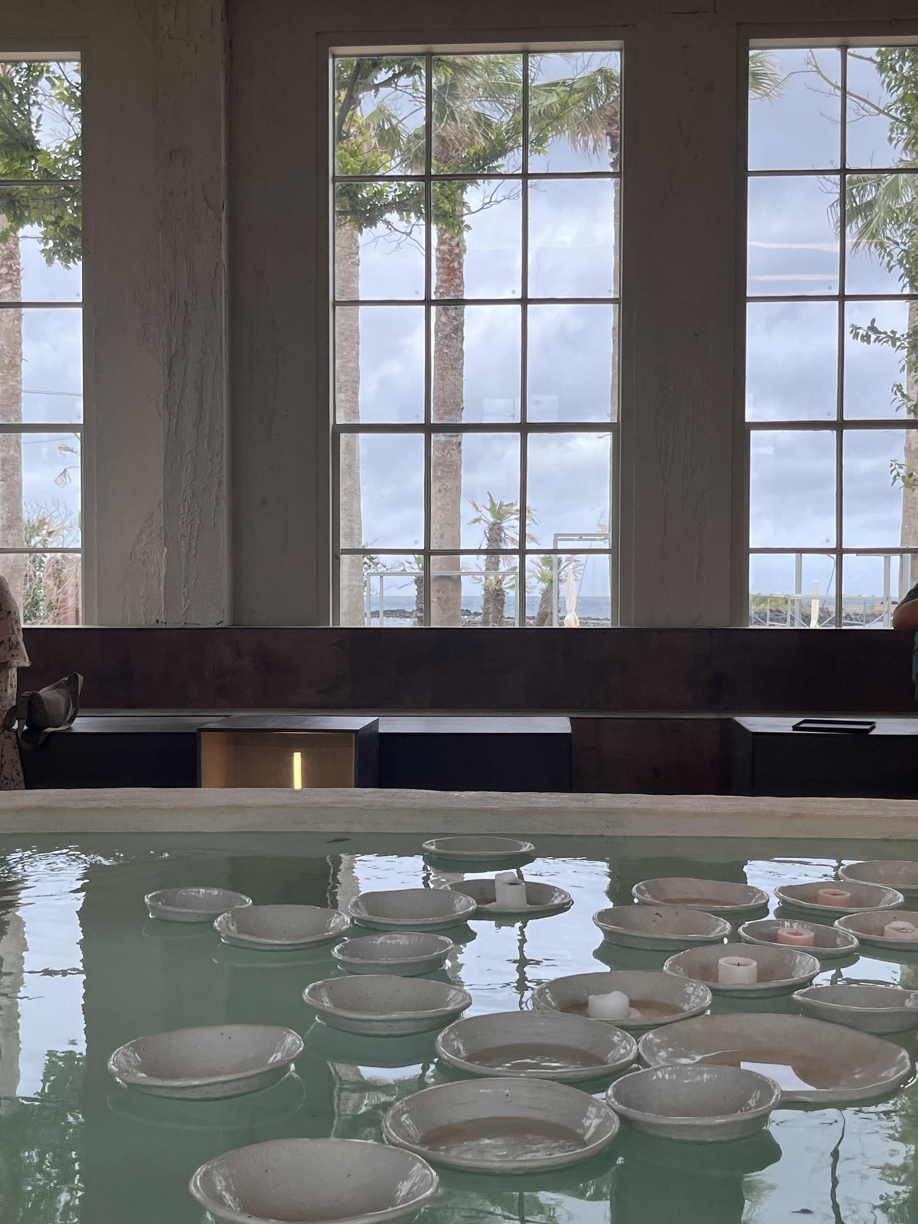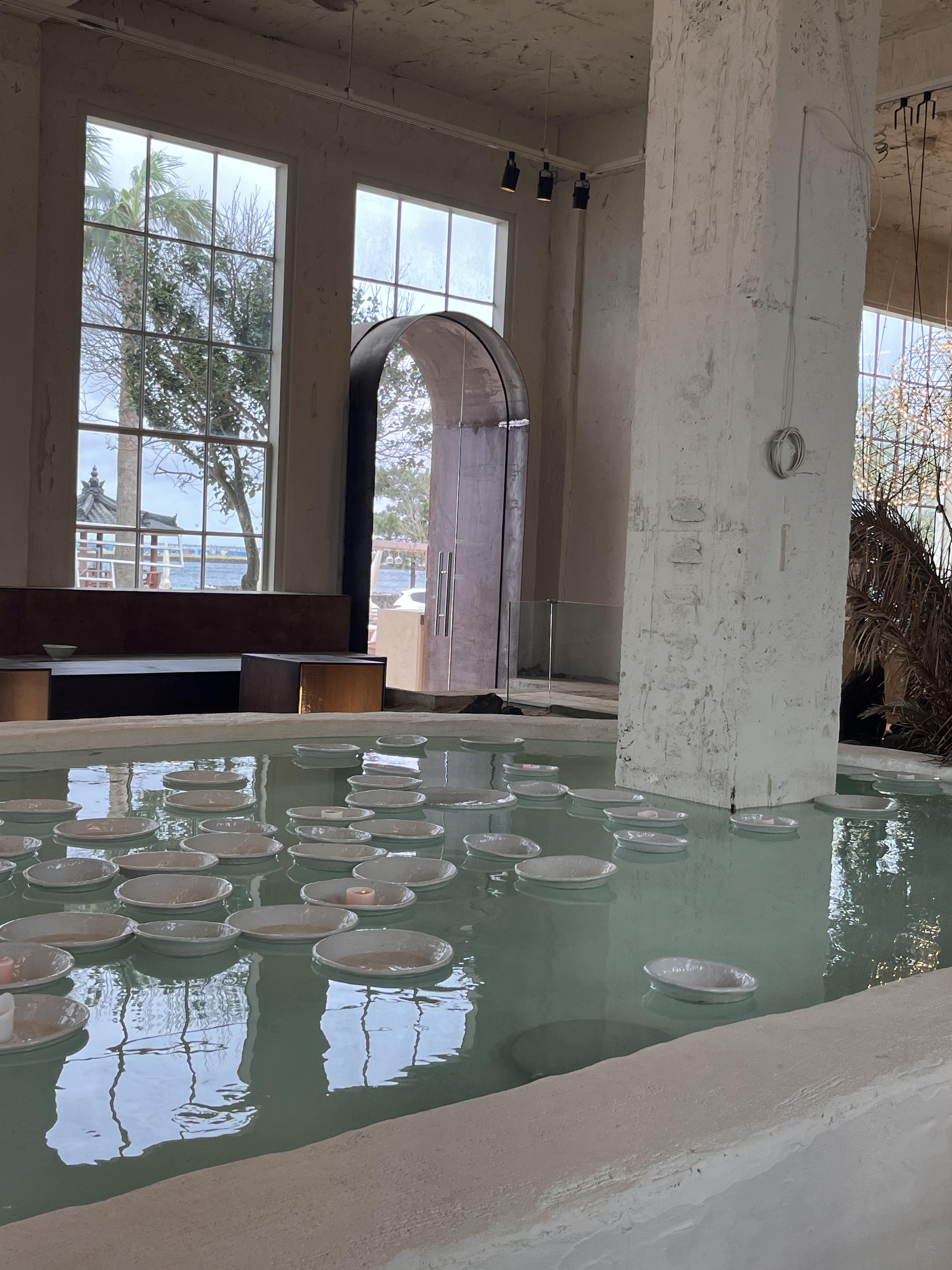 카페 가운데엔 연못? 수영장? 같이 물이 받아져 있고 그 물에 그릇들을 띄워놓았어요. 그릇들이 물의 흐름에 맞게 움직이고, 그릇끼리 부딪치는 소리가 꽤 듣기 좋았어요. 와장창 소리가 나는 게 아니고 간간히 쨍쨍 소리 나는 게 음악소리와 어우러져 듣기 좋았어요.
