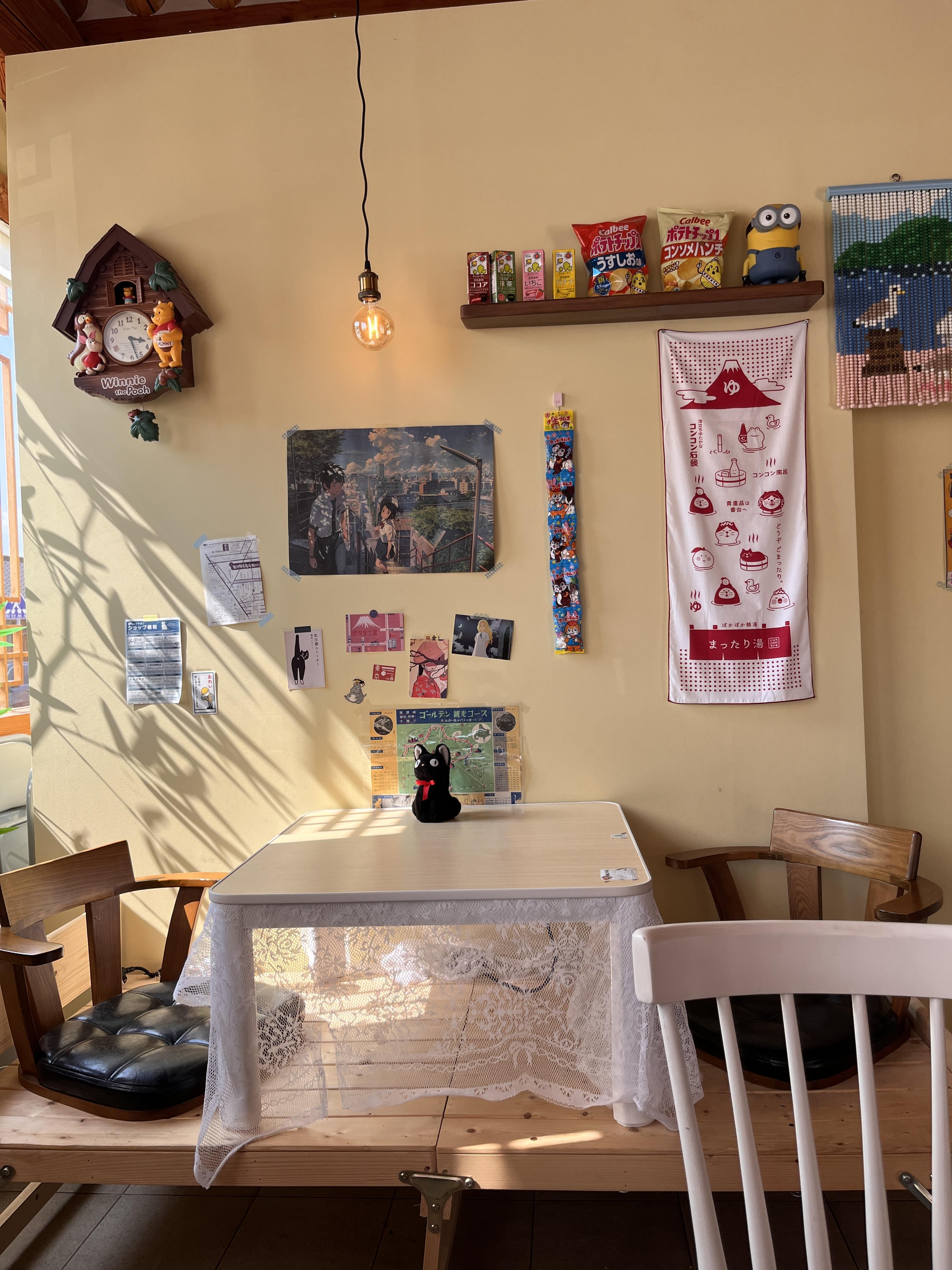카페 내부는 아기자기한 크기였고, 테이블은 10개 정도 되는 것 같더라고요. 평상자리도 있어요. 저희는 평상자리에 앉았어요. 평상자리는 2인용 테이블로 구성되어 있었고, 벽엔 일본애니메이션 포스터 및 스티커들이 붙어있어요.