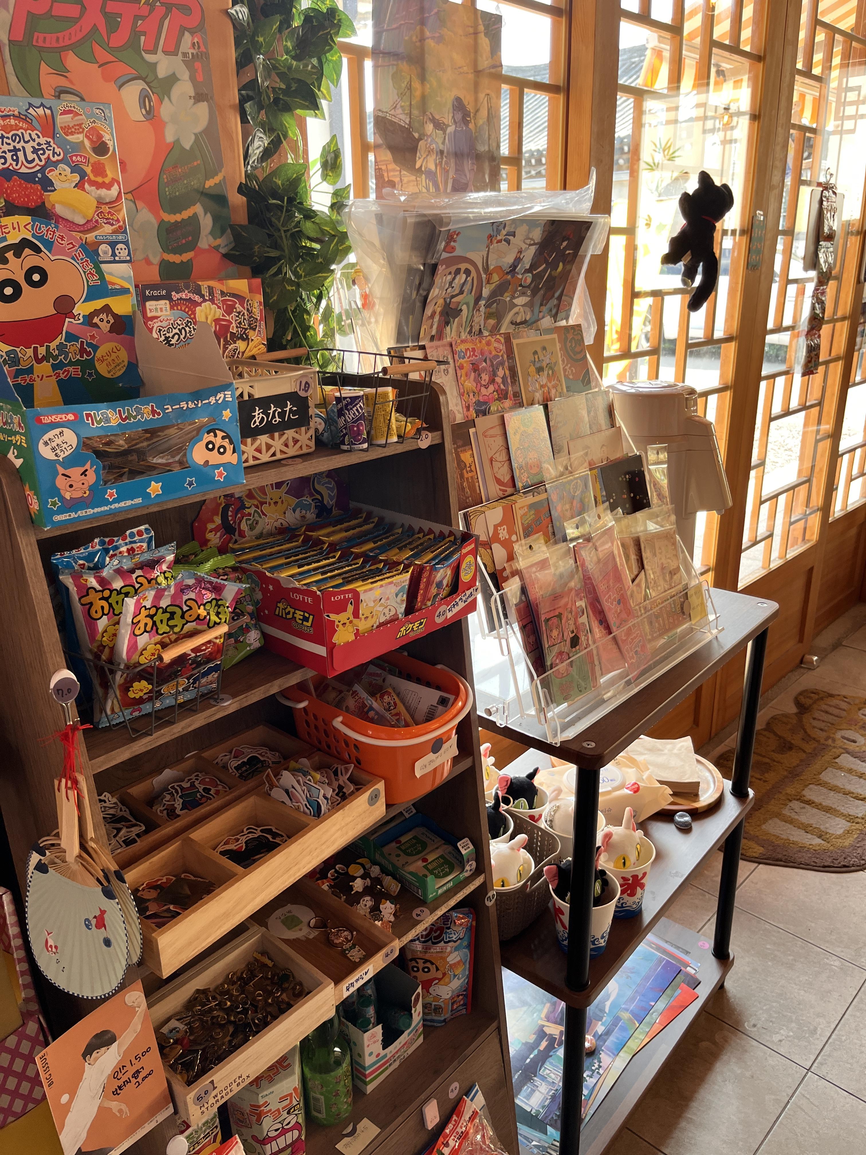 카페 곳곳엔 일본 엽서와 간식류들을 판매하고 있었어요. 저는 이런 것들을 잘 구매하진 않는데 많이들 구매하시더라고요.
